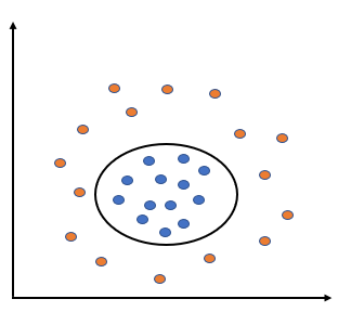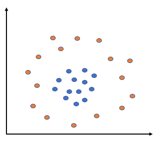 상기 예시와 같이 선형 초평면으로 클래스의 분리가 효과적이지 못할 경우 비선형 SVM 모형을 사용해야 한다. 가령, 아래 그림의 경우는 선형 SVM 모형으로는 효과적인 분류를 하기 어렵다.