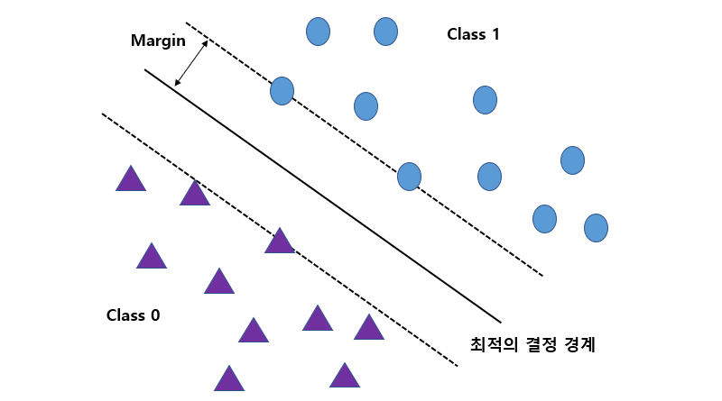 SVM은 각 클래스의 최외각에 위치한 관측치인 서포트 벡터 (Support Vector)를 토대로 초평면을 설정한다. 아래 그림에서 각 클래스의 최외각에 위치한 서포트 벡터들을 연결하는 두 개의 평행선을 그었을 때 이 두 개의 평행선 중앙에 놓인 가상의 선이 초평면에 해당한다. 이 초평면과 각 클래스의 서포트 벡터간의 거리를 마진 (Margin)이라고 한다. 한편, 두 클래스를 구분하는 마진 사이에 오류를 허용하지 않는 SVM을 하드마진 SVM (Hard Margin SVM)이라 하고, 마진 사이에 어느 정도의 오류를 허용하는 SVM을 소프트마진 SVM (Soft Margin SVM)이라고 한다.