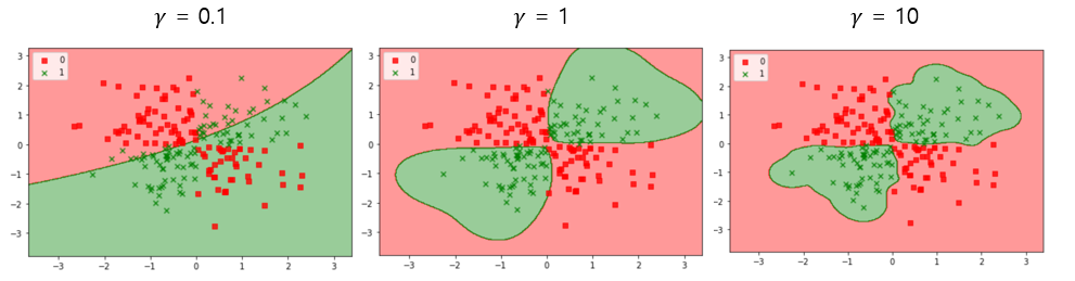 이 모형은 결국 두 개의 데이터 xi, xj의 거리를 가우시안 커널에 의해 표현한 것인데, 여기에서 (Gamma)는 하나의 데이터 샘플이 영향력을 행사하는 거리를 결정하는 매우 중요한 인자다. 가 클수록 데이터 포인트들이 영향력을 행사하는 거리가 짧아지고 가 작을수록 데이터 포인트들이 영향력을 행사하는 거리가 멀어진다. 다음 그래프는 SVM( ) 함수의 비용 인자 C값은 1로 동일한 상태에서 의 값을 0.1부터 10까지 변화를 준 것을 표현한 것이다.