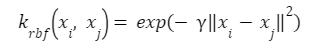 가우시안 커널 (Gaussian Kernel)은 성능이 우수해 가장 자주 활용되는 커널 기법으로서 RBF (Radial Basis Function) 커널이라고도 부른다. 가우시안 커널은 데이터를 무한한 다항식 차원으로 재포지셔닝할 수 있는 방법으로서 일반적인 모형은 다음과 같다.