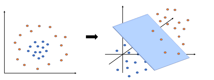 커널 기법이란 커널 함수를 이용하여 주어진 데이터를 고차원 공간으로 변환하여 선형 분류 혹은 수치 예측을 가능하게 해주는 방법이다. 즉, 커널 기법을 적용한다는 것은 벡터 간의 내적을 커널 함수로 대체한다는 의미이다.