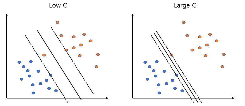 왼쪽 그림은 인자 C를 낮게 설정했을 경우인데, 이때는 비록 데이터를 잘못 분류하는 경우가 생기지만 조금 더 여유로운 마진을 갖는 일반화된 초평면을 설정한다. 한편, 오른쪽 그림과 같이 인자 C를 높게 설정했을 때는 주어진 데이터에 대해 완벽하게 분류가 되었지만, 마진 폭이 작아 과잉적합의 우려가 존재한다. 즉, 인자 C는 얼마나 많은 데이터 샘플이 다른 클래스에 놓이는 것(마진 오류)을 허용하는지를 결정한다.