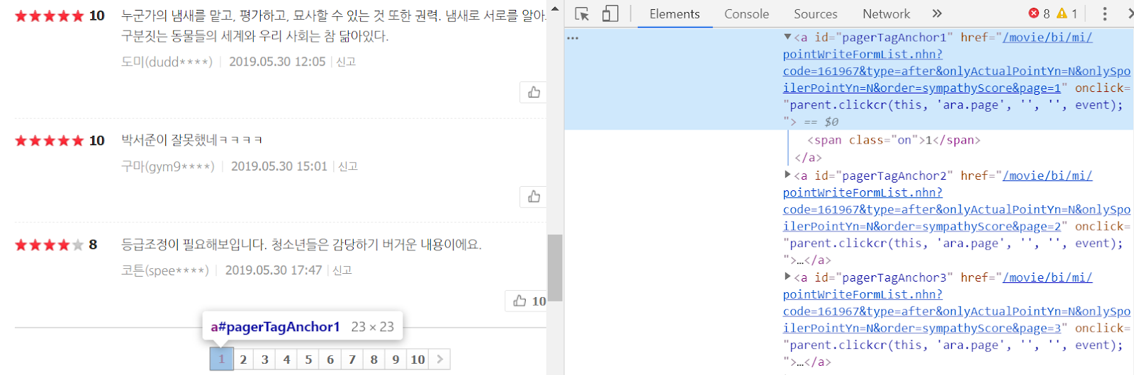 ▶ 페이지 버튼은 href 속성을 가지는 a 태그로 감싸인 것을 알 수 있다. a 태그는 하이퍼링크를 설정하는 태그이며, href 속성은 클릭 시 이동할 URL을 나타낸다. 해당 URL에 접속하면 해당 관람객 평점만 존재하는 웹 사이트에 접속할 수 있으며, 페이지를 이동할 때마다 URL 맨 끝의 page 값이 달라지는 것을 확인할 수 있다.
