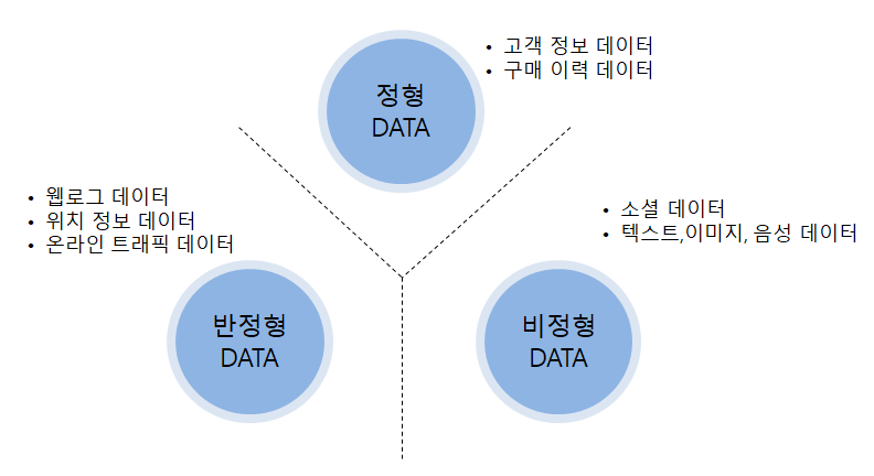 텍스트 마이닝이 다루는 데이터는 소위 빅 데이터 (Big Data)인데, 엄밀하게 말해 빅 데이터는 세 가지 유형으로 나눌 수 있다 [그림 1 참조]. 우선, 앞서 우리가 다루어왔던 정형 데이터 (Structured Data)는 구조화되어 있는 데이터를 통칭하는 것으로 다양한 데이터가 포함된다. 반정형 데이터 (Semi-Structured Data)는 형태 (Schema)는 있지만, 연산이 불가능한 형태의 데이터로 보통 XML, HTML, JSON, 로그 형태의 데이터(웹 로그, 센서 데이터) 등을 의미한다. 마지막으로 비정형 데이터 (Unstructured Data)는 형태가 없으며, 연산이 불가능한 데이터로 영상, 이미지, 텍스트 데이터 그리고 트위터, 페이스북과 같은 소셜 네트워크 서비스 (Social Network Service, SNS)에서 얻을 수 있는 소셜 데이터 등을 의미한다.