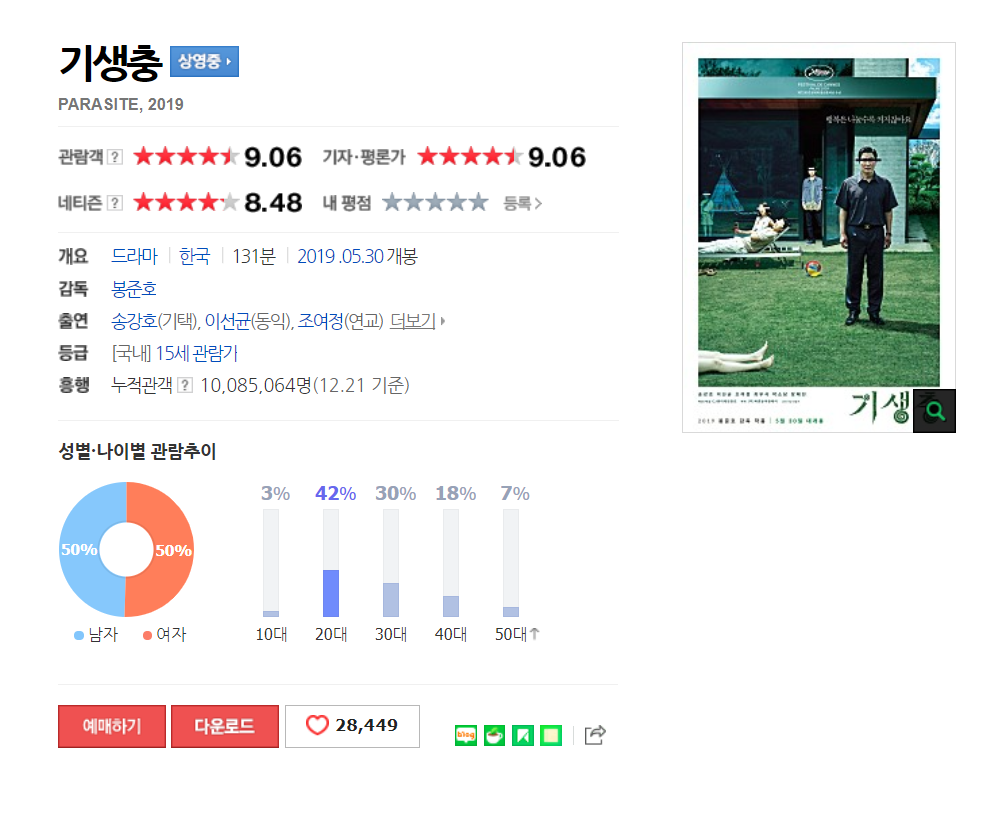 이번 실습에서는 2020년 제92회 아카데미 시상식에서 감독상, 작품상, 각본상, 국제영화상 등 4개 부분을 석권하며 전 세계 영화인들의 관심을 듬뿍 받았던 영화 ‘기생충’에 대한 평점과 리뷰 정보를 사용하고자 한다. 평점은 텍스트 분석에 직접적으로 사용되지는 않지만, 텍스트 문서의 특성을 살펴보기 위해 추출한다. 데이터는 네이버 영화 사이트를 통해 추출할 것이다.